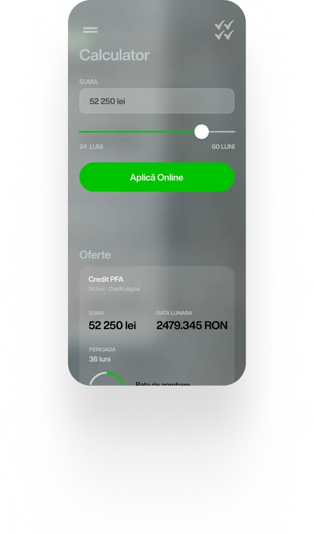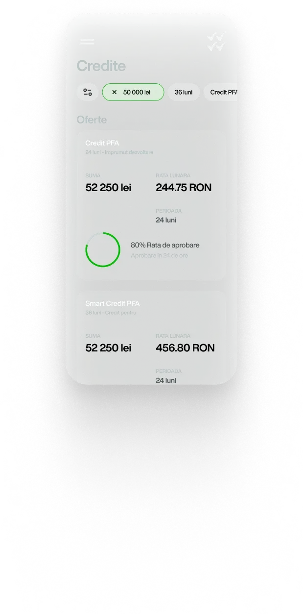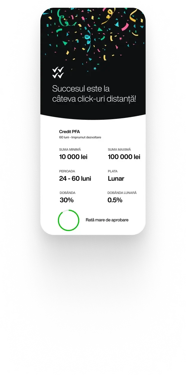 Te încurajăm să aplici pentru credit PFA. Analiza dosarelor de credit este amplă și încercăm să găsim soluții de finanțare pentru orice client.